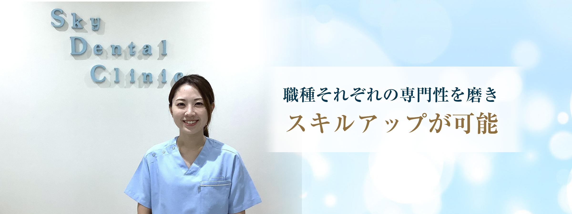 Sky Dental Clinicでは、歯科医師・歯科衛生士・歯科助手・歯科技工士のほか、管理栄養士・栄養士・事務スタッフを募集中です。各種マニュアル完備、17時30分退勤、有休消化率100%など、働きやすい環境をご用意しています。