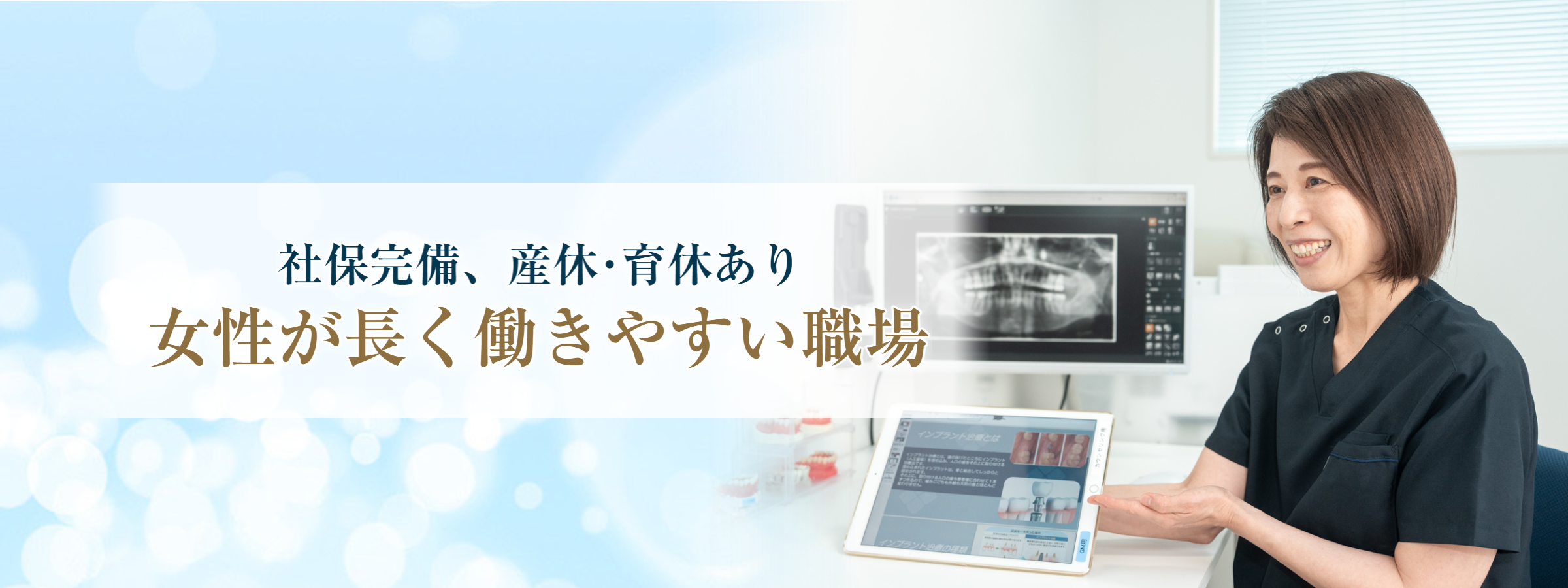 そんな当院では現在、歯科医師、歯科衛生士、歯科助手・受付、歯科技工士、管理栄養士・栄養士、事務の6つの業種にてスタッフを募集しています。